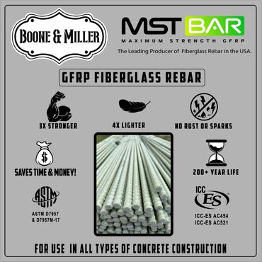 distribution partner for MST-Bar GFRP fiberglass rebar. The benefits of GFRP rebar are numerous and we know that fiberglass rebar is a superior choice in almost every application when it comes rebar selection. Pricing is very competitive with steel rebar as well. MST-Bar is 4X lighter than steel and 3X times stronger, it does not rust or corrode and the bond strength with concrete is 3X higher than steel. Concrete reinforced MST-Bar rebar has considerably less cracking and any cracks that do appear are smaller, add to that a life span easily exceeding 200+years and it makes MST-Bar the obvious choice. It's also MUCH easier on your install crews. They can install more bar quicker with less strain, Available in #3 bar up to #12 bar with sizes as long as 60 feet. Give Boone & Miller a call to see how MST-Bar fiberglass rebar can improve your next concrete project.